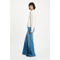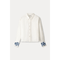Details: witte basis, opvallende blauwe tekst/steentjes op de manchetten