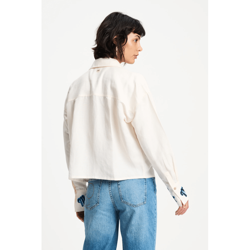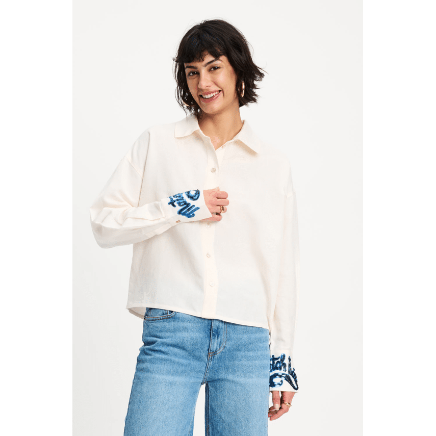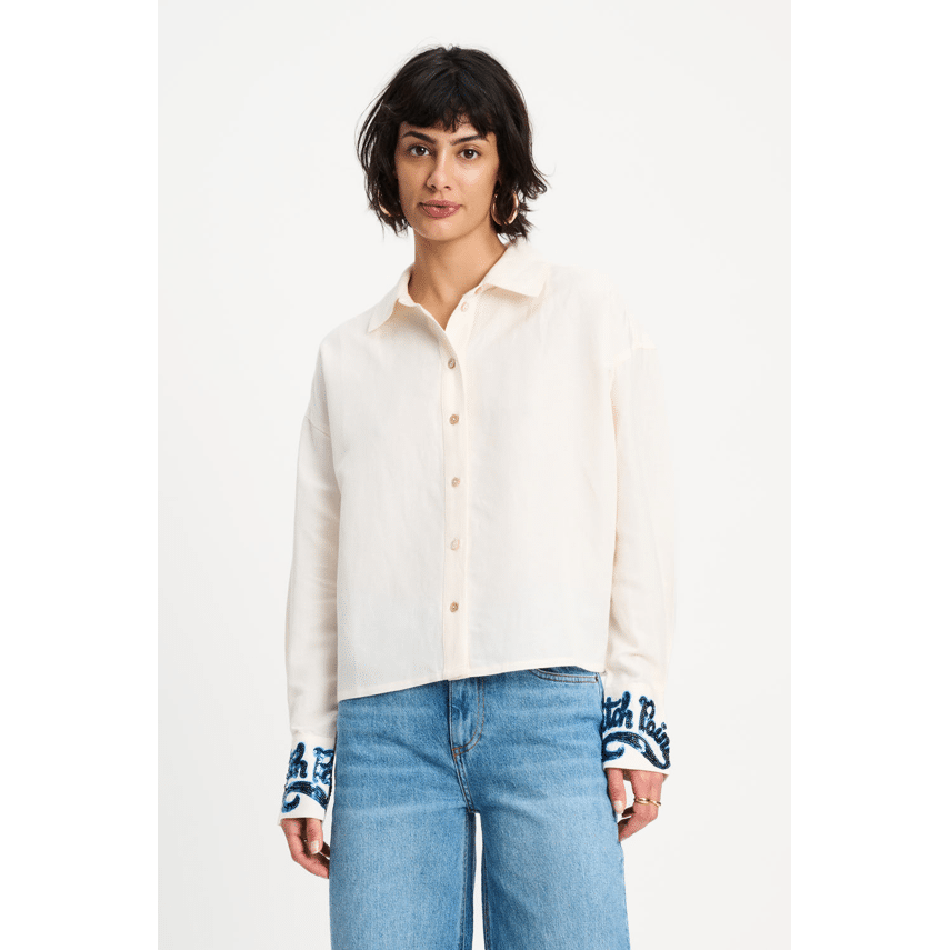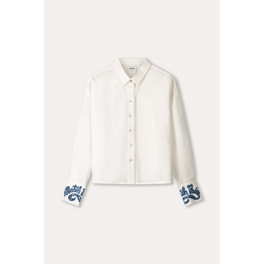 Blouse van POM Amsterdam. Een tijdloze witte blouse met een verrassende twist! De blouse heeft een mooie, luchtige uitstraling en is daardoor ideaal voor het voorjaar en de zomer. Het echte eyecatcher-detail zit in de mouwen: daar zorgen de blauwe, sprankelende letters voor een speelse en unieke finishing touch.