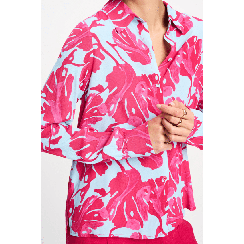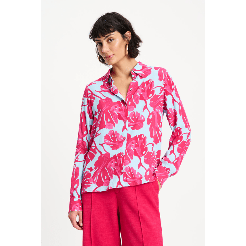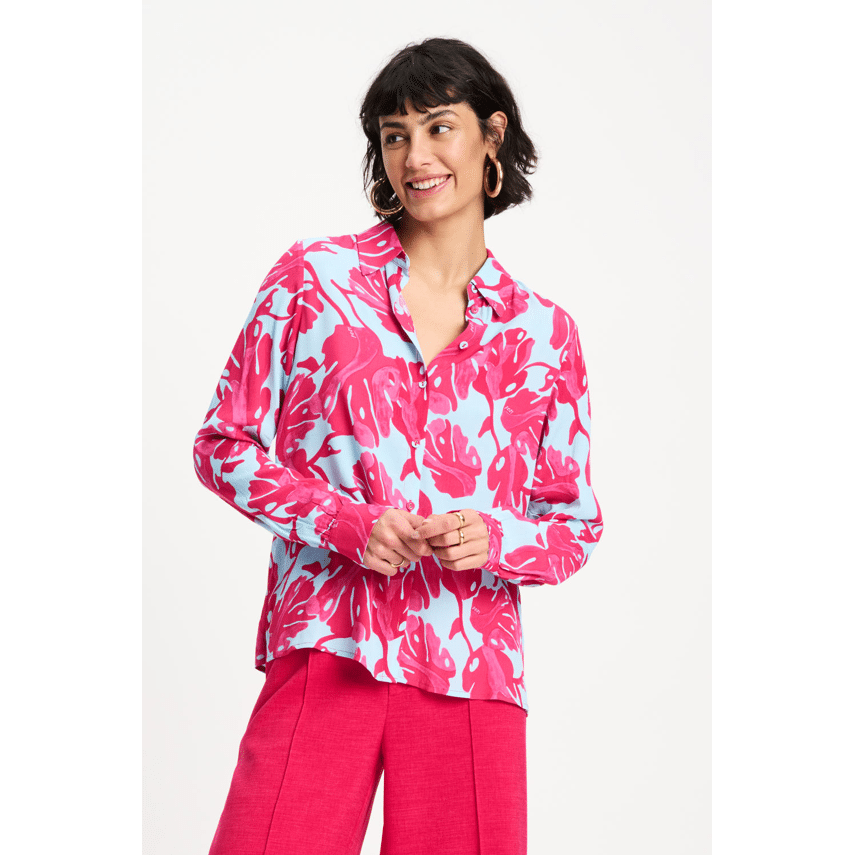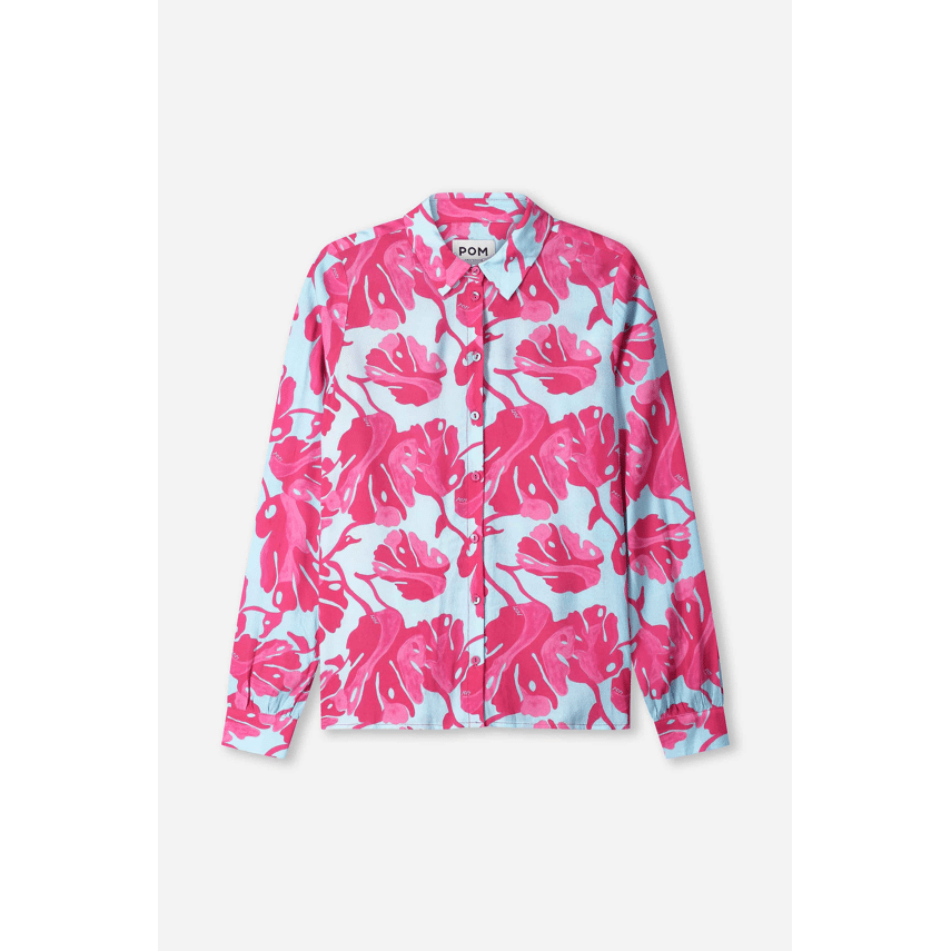 Blouse van POM Amsterdam. Deze blouse is echt een kleurknaller! De combinatie van lichtblauw met felroze bladerenprint geeft meteen een zomerse, vrolijke uitstraling. Door de klassieke kraag en knoopsluiting blijft hij mooi in balans: speels, maar toch stijlvol. Perfect als statement item in je garderobe.