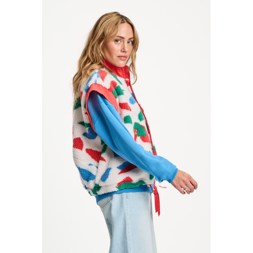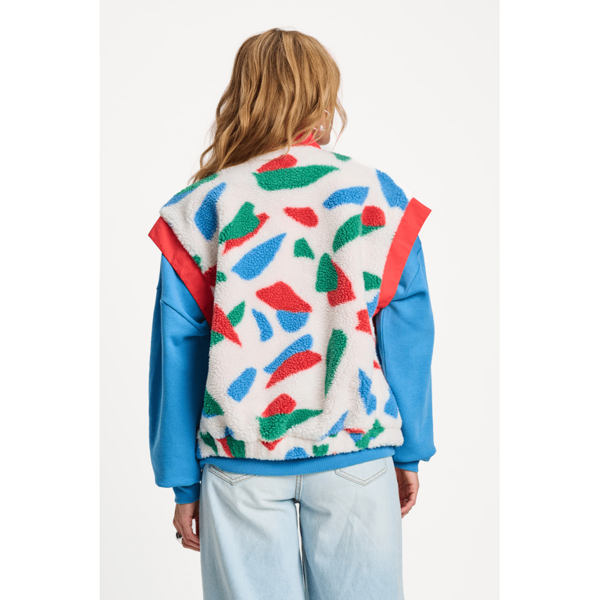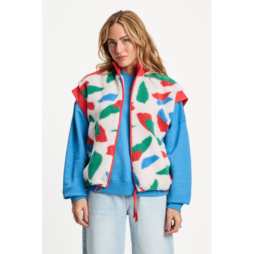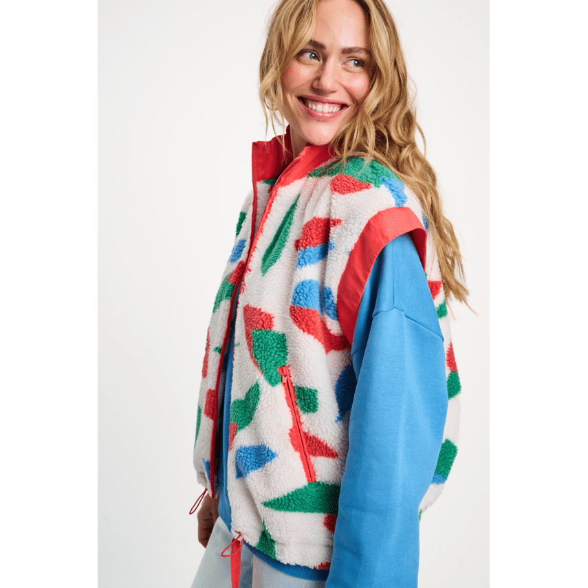 Bodywarmer van POM Amsterdam. Deze teddy bodywarmer is echt een fun item waar je outfit meteen van opfrist. De offwhite teddy basis met kleurrijke print in rood, groen en blauw geeft een speelse look, terwijl de rode bies en rits zorgen voor een stoer accent. Ideaal voor laagjes in het voorjaar of frisse zomeravonden.