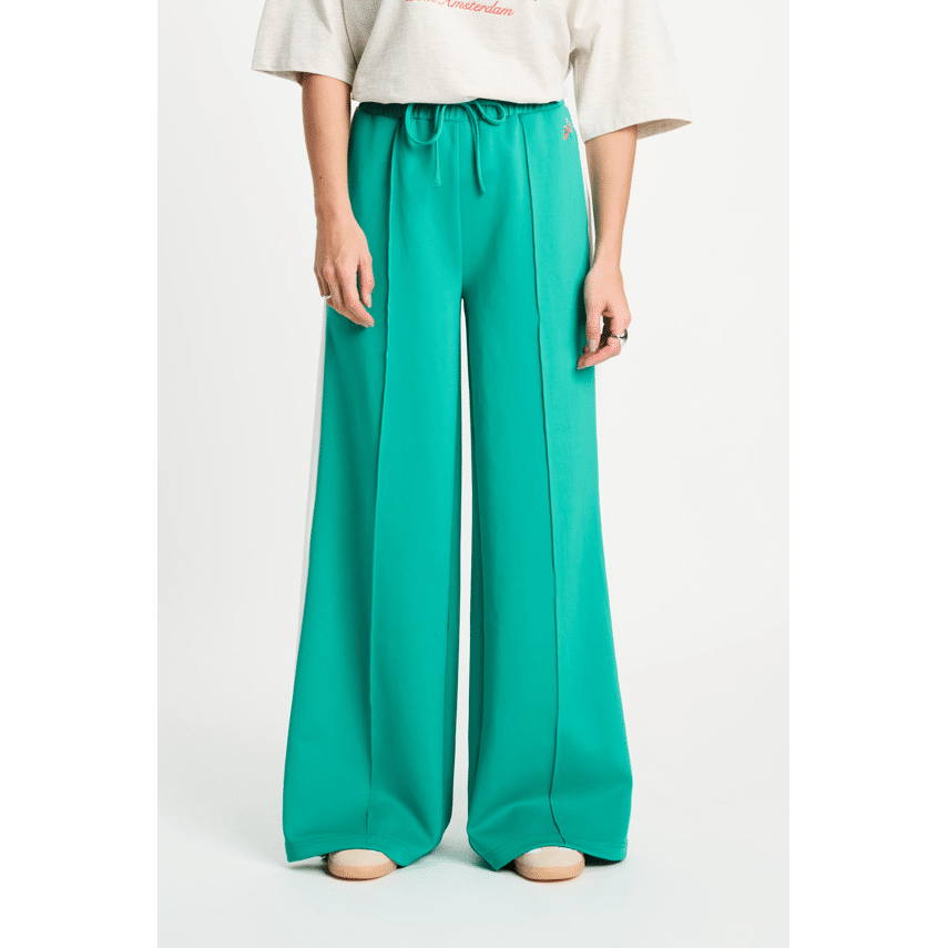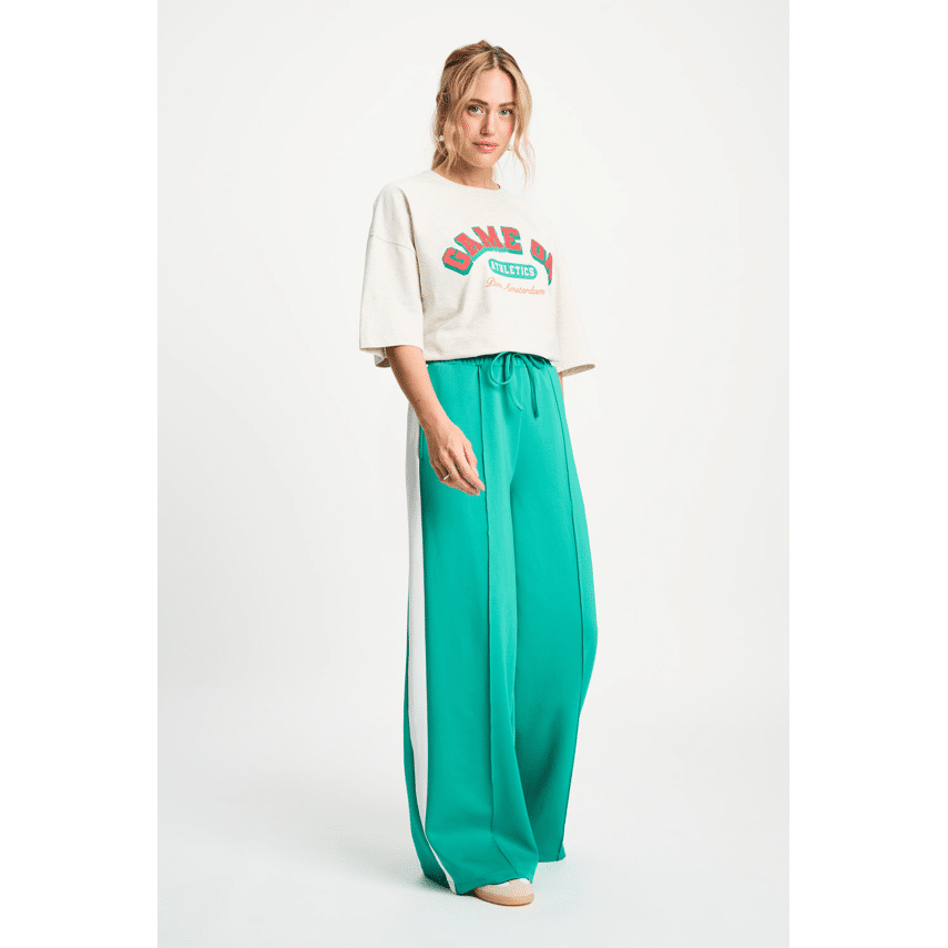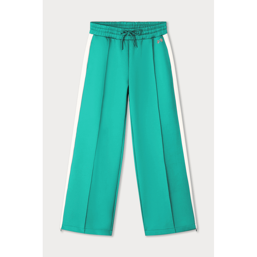 Broek van POM Amsterdam. Deze stijlvolle broek in een prachtige groene tint is een perfecte mix van comfortabel en trendy. De elastische tailleband met strikkoord zorgt voor een fijne pasvorm, terwijl de wijde pijpen een elegante, moderne uitstraling geven. De contrasterende witte bies aan de zijkant maakt de look extra sportief en geeft de broek een speelse twist. Ideaal voor zowel een casual dag als een nettere outfit.
