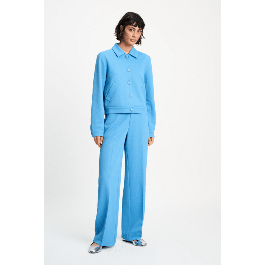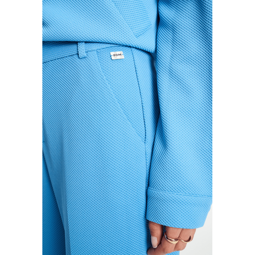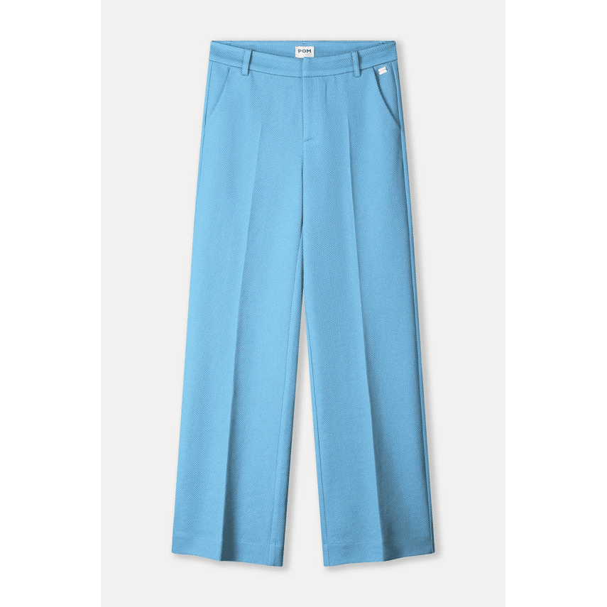 Broek van POM Amsterdam. Deze pantalon in een frisse lichtblauwe kleur is zo’n item waar je eindeloos mee kunt combineren. De rechte pijp en nette persvouwen geven ‘m een chique uitstraling, terwijl de subtiele structuur in de stof zorgt voor een speelse, luxe touch. Perfect voor zowel een casual dag als een nette look.