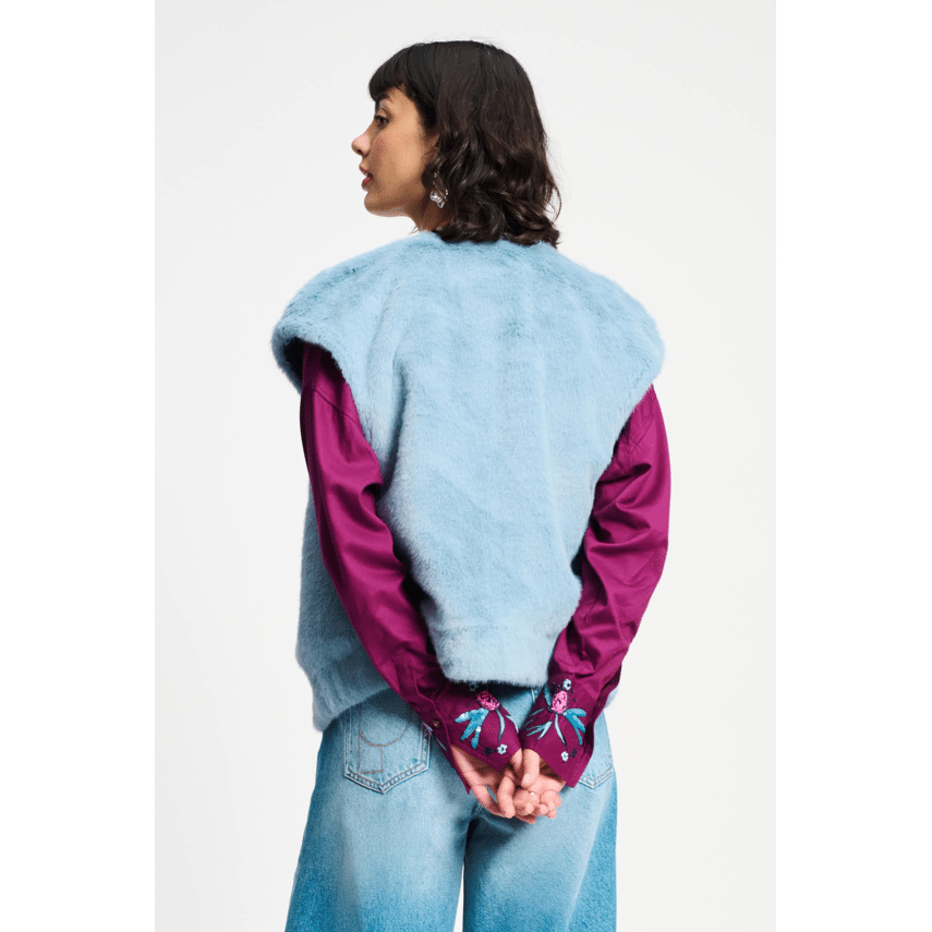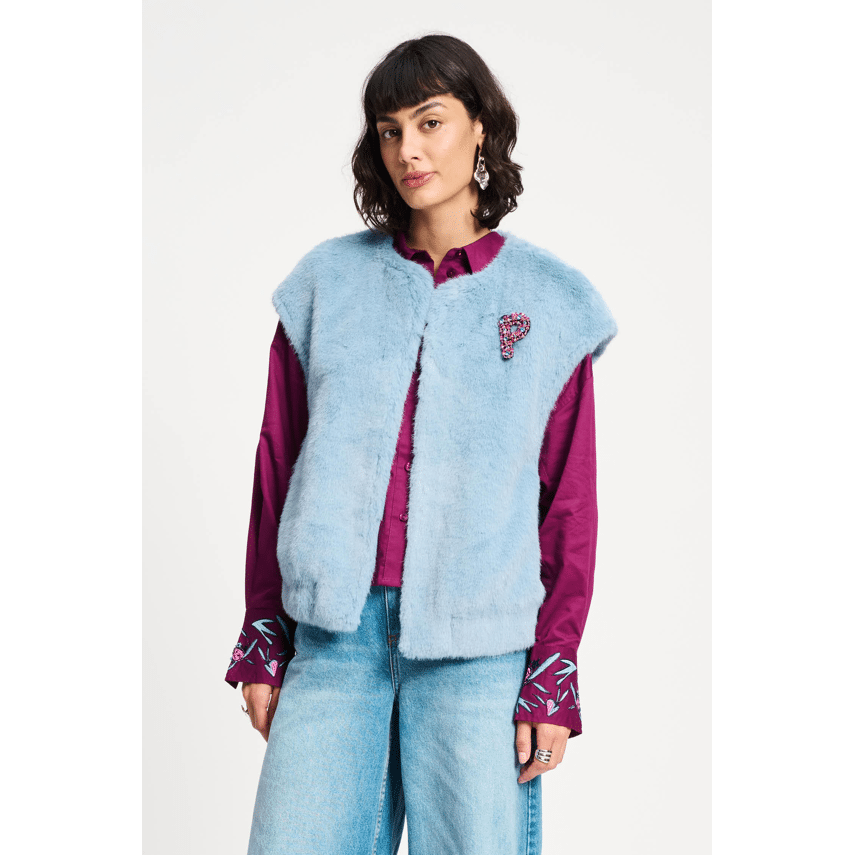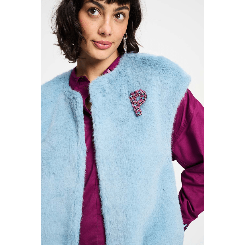 Gilet van POM Amsterdam. Dit lichtblauwe gilet is gemaakt van een zachte faux fur kwaliteit die heerlijk warm en comfortabel draagt. De voering heeft een speelse bloemenprint en op de borst is een opvallende broche in de vorm van de letter P bevestigd, wat zorgt voor een unieke en eigentijdse uitstraling. Een ideaal laagje om je outfit net dat beetje extra te geven.