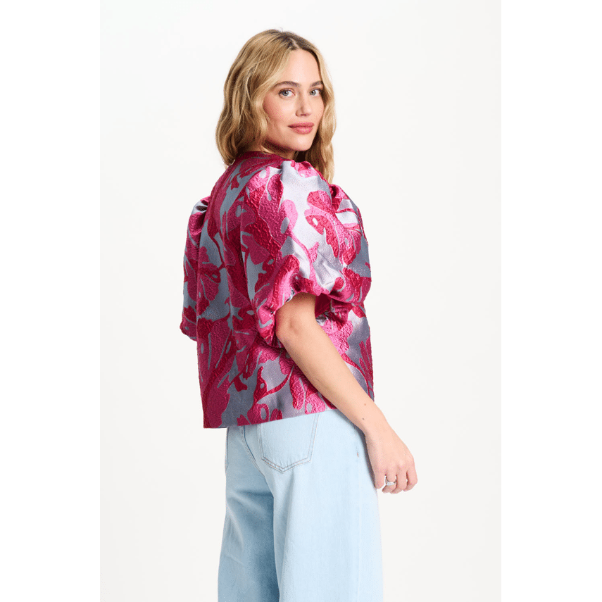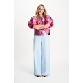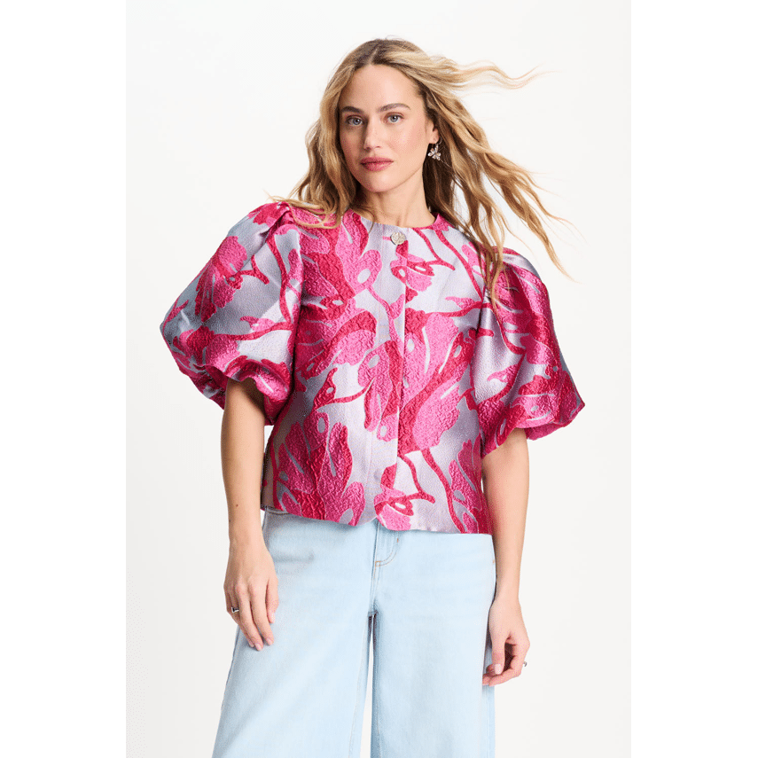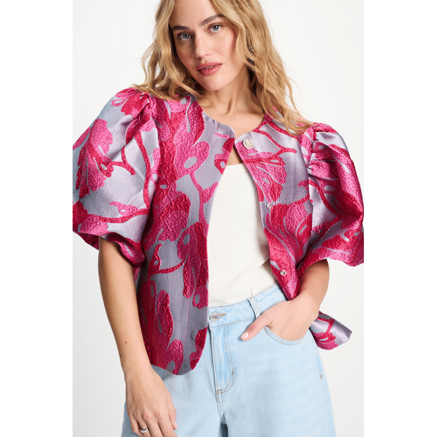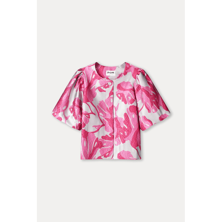 Jasje van POM Amsterdam. Dit jasje is een echte eyecatcher! De luxe jacquardstof met roze bladprint geeft een chique, maar ook super speelse uitstraling. Door de korte lengte en de wijde mouwen krijgt het jasje een modern silhouet dat perfect past bij een feestelijke én casual look.