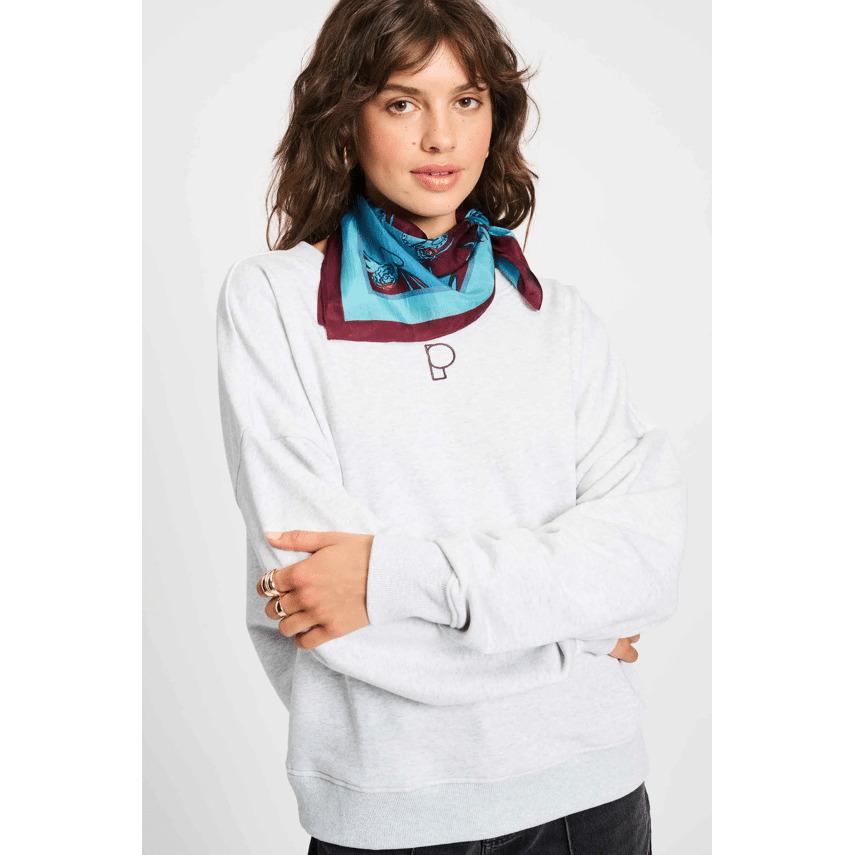 Sjaal van het merk POM Amsterdam. Deze vierkante sjaal heeft een prachtig dessin in diepe bordeauxrode en blauwe tinten, verrijkt met bloemmotieven in roze en wit. De sjaal is gemaakt van een zachte, soepele stof en voelt comfortabel aan op de huid. Het compacte formaat maakt hem ideaal om als halsdoek, haaraccessoire of tasdetail te dragen.